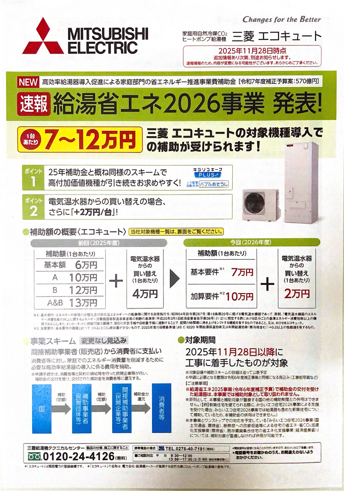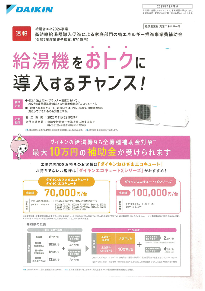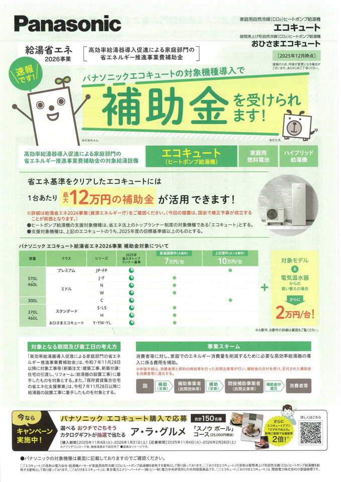 いつもお世話になっております。 岡山のカワタ産業です。 国の「給湯省エネ2026事業」により、高効率給湯機(エコキュート等)の対象機種を導入すると、1台あたり最大12万円の補助金が受けられます。